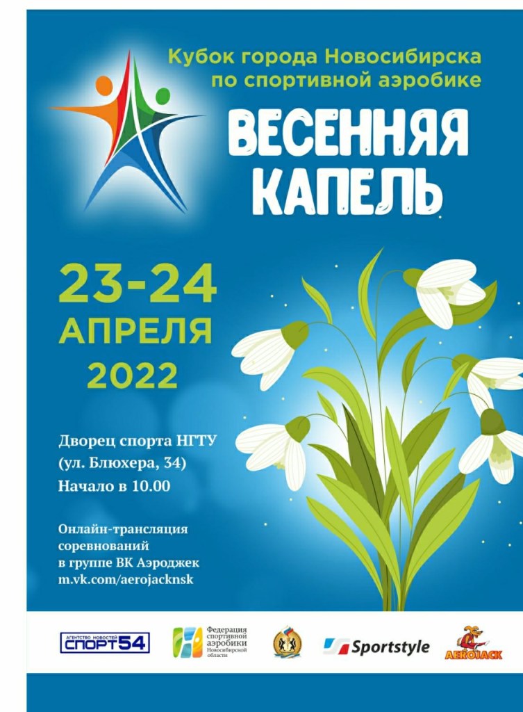 23 и 24 апреля во дворце спорта НГТУ по адресу ул. Блюхера 34 пройдет очередной этап кубка города по спортивной аэробике «Весенняя капель». На соревнования допускаются зрители в масках. Онлайн-трансляция будет доступна в группе ВК AeroJack https://vk.com/aerojacknsk