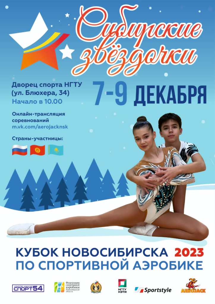 С 7 по 10 декабря во дворце спорта НГТУ по адресу ул. Блюхера, 34 пройдут Всероссийские соревнования «Аэробика Сибири» и международный турнир «Сибирские звёздочки». В стартах примут участие более 1000 атлетов из Алтайского, Забайкальского, Красноярского краев, республики Хакасия, Ханты-Мансийского и Ямало-Ненецкий автономных округов, Иркутской, Кемеровской, Московской, Новосибирской, Омской, Сахалинской и Томской областей. Также соревнования посетят делегации из Казахстана и Киргизии.